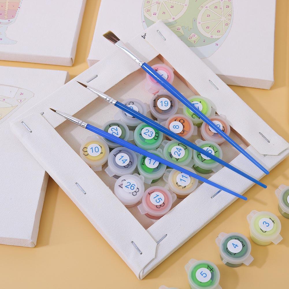 These mini paintings are designed for all skill levels, so anyone can enjoy the joy of painting by numbers. Each kit includes several small canvases, acrylic paints, and 9 brushes in different sizes.