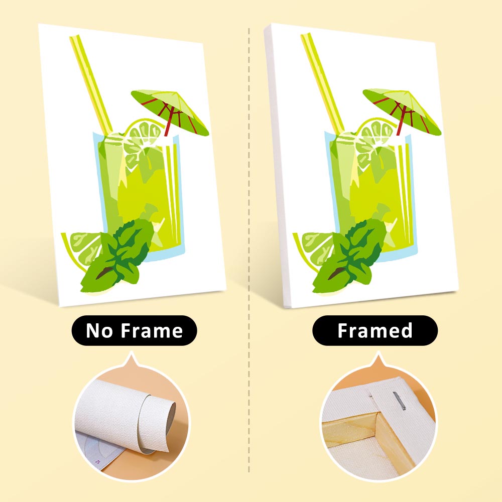- With frame: Canvases are pre-mounted on a wooden frame – ready to hang.