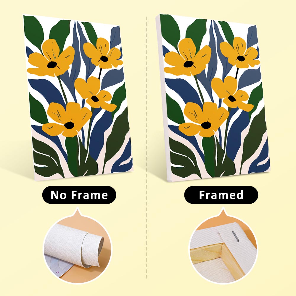 - With frame: Canvases are pre-mounted on a wooden frame – ready to hang.