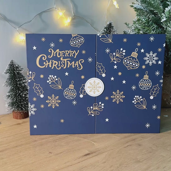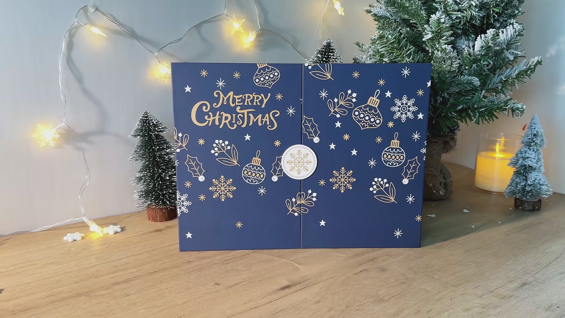 The navy-blue, gold-accented holiday box is a festive eye-catcher and doubles as a keepsake organizer after the holidays.