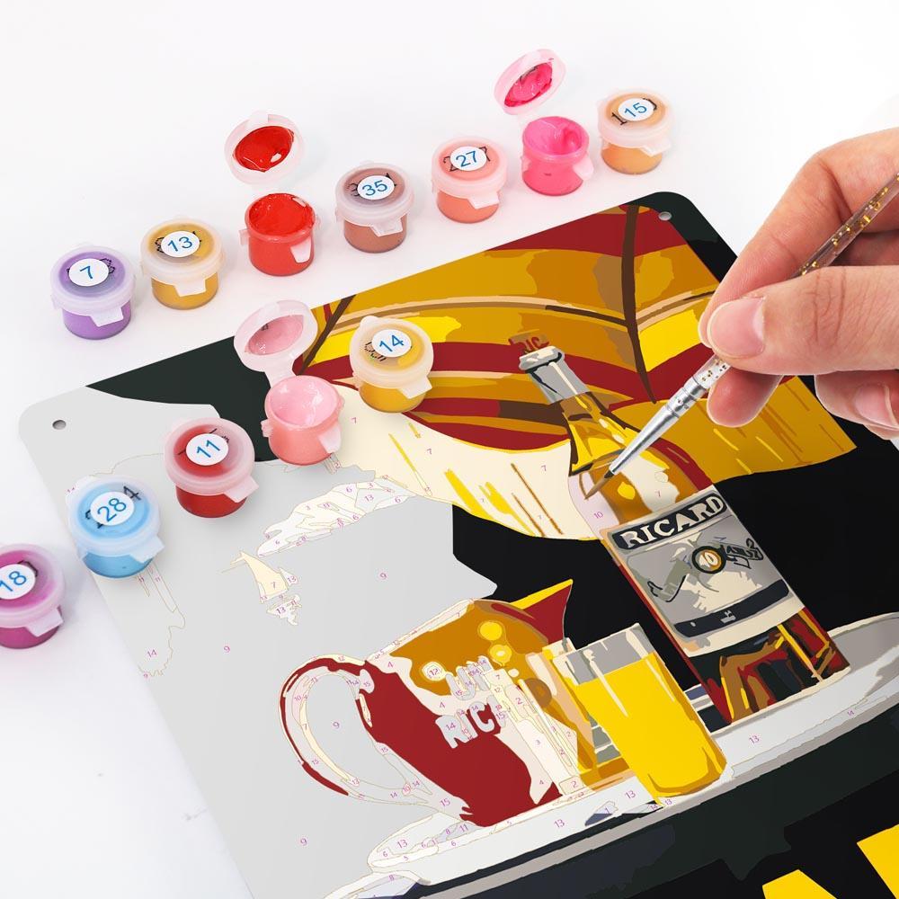 Our Paint by Numbers – Vintage Bar Wall Art | Ricard Apéritif Anisé (Night Version) blend nostalgic charm with hands-on creativity. Each kit features a pre-designed metal sign with numbered sections—just match the numbers to the paint colors and bring the scene to life with every brushstroke.